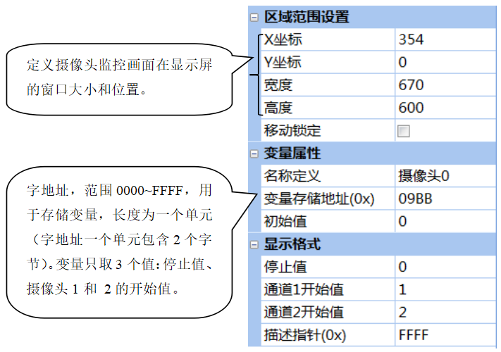 攝像頭控件是在顯示屏指定區(qū)域顯示攝像頭監(jiān)控畫面。變量只有3個取值:停止值、攝像頭通道1的開始值、攝像頭通道2的開始值。當通過0x82指令向變量單元寫入開始值時,指定區(qū)域將播放攝像頭監(jiān)控畫面;當寫入停止值時,視頻停止播放。