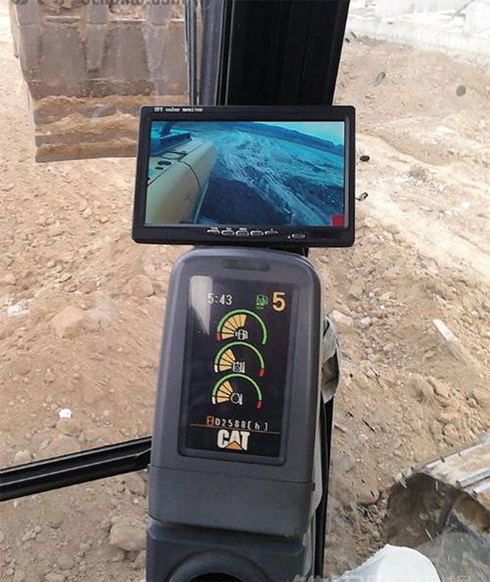 挖掘機、吊車等工程機械存在原地旋轉工況,而駕駛操作人員視線有限,出于安全考慮,必須借助攝像頭監(jiān)控視線盲區(qū)。下圖為卡特一款挖機駕駛室照片,下方為挖機監(jiān)控器,用于顯示挖掘機燃油油量、冷卻水溫、機油壓力等設備狀態(tài)參數(shù),上方加裝的顯示屏用于連接攝像頭用于顯示駕駛員視線盲區(qū)場景。