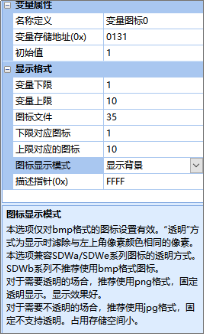 在VGUS組態(tài)軟件中,任何與圖標(biāo)相關(guān)的控件均支持png格式的圖標(biāo)顯示。用戶端無需任何修改,只需要在上位機開發(fā)軟件中,添加相應(yīng)的素材即可。控件的設(shè)置方法與以前一致,只需要設(shè)置對應(yīng)圖標(biāo)文件和圖標(biāo)ID號。